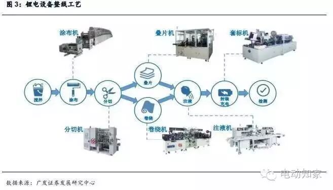 锂电设备生产线主要分为三个阶段:搅拌涂布阶段(电极制作)、卷绕注液阶段(电芯合成)、包装检测阶段(化成封装)。电极制作阶段对应的锂电设备主要包括真空搅拌机、涂布机、辊压机等,电芯合成阶段主要包括模切机、卷绕机、叠片机、注液机等,化成封装阶段包括化成机、检测设备、pack自动化设备等。