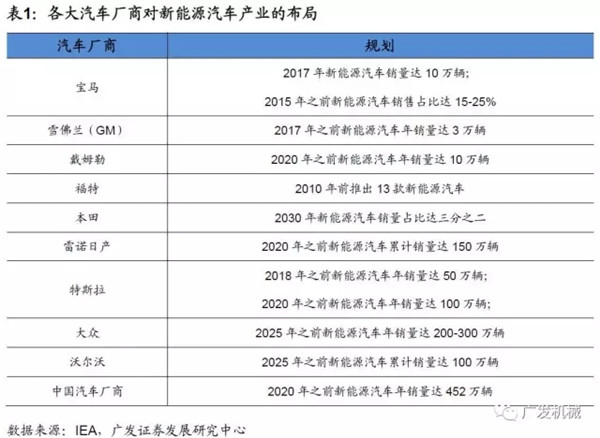 全球各大汽车厂商都在规划新能源汽车产业。面对新能源汽车的高速发展,全球各个汽车厂家各自发布了雄心勃勃的新能源汽车计划。根据IEA披露的各大汽车厂商对新能源汽车产业的规划,到2020年,全球新能源汽车的保有量会达到900-2000万辆。