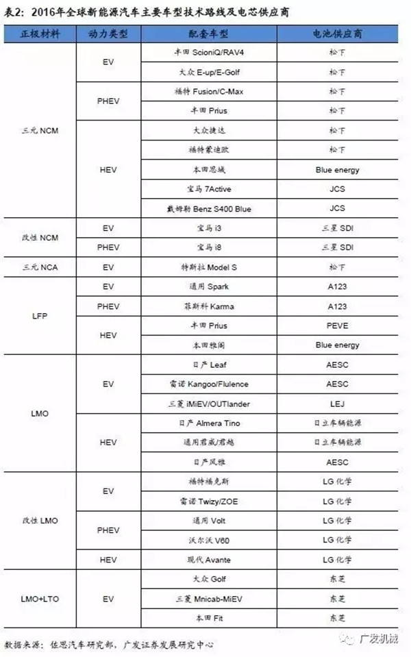 根据BloombergNewEnergyFinace的统计,2017年第一季度,全球锂电池出货量(仅为混合动力汽车和纯电动汽车用电池)为5273MWh,其中松下占比最多,为42%。2016年全球主流新能源汽车采用的正极材料主要有三元NCM、改性NCM、三元NCA、改性LMO等,主流的电池供应商有松下、三星SDI、LG化学等。汽车企业与锂电厂商的合作日益密切,绑定关系逐渐成型。锂电池行业龙头企业扩产规划明确。在市场及各国政策的双重驱动下,一线动力电池厂商持续扩产。