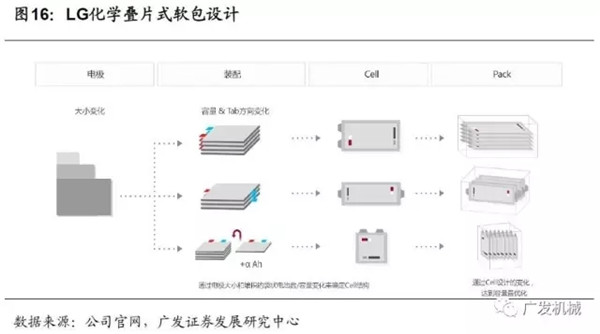 在技术上,LG化学正极采用的主要是三元NCM材料,在电池包装方面,LG化学大部分采用叠片式软包设计,是海内外公认的软包龙头企业。软包锂电池所用的关键材料—正极材料、负极材料及隔膜—与传统的钢壳、铝壳锂电池之间的区别不大,最大的不同之处在于软包装材料(铝塑复合膜),这是软包锂电池中最关键、技术难度最高的材料。软包电池的包装材料和结构使其拥有一系列优势。1)安全性能好,软包电池在结构上采用铝塑膜包装,发生安全问题时,软包电池一般会鼓气裂开,不会爆炸。2)重量轻,软包电池重量较同等容量的钢壳锂电池轻40%,较铝壳锂电池轻20%。3)内阻小,软包电池的内阻较锂电池小,可以极大的降低电池的自耗电。4)循环性能好,软包电池的循环寿命更长,100次循环衰减比铝壳少4%~7%。5)设计灵活,外形可变任意形状,可以更薄,可根据客户的需求定制,开发新的电芯型号。软包电池的不足之处是一致性较差,成本较高,容易发生漏液,技术门槛高。