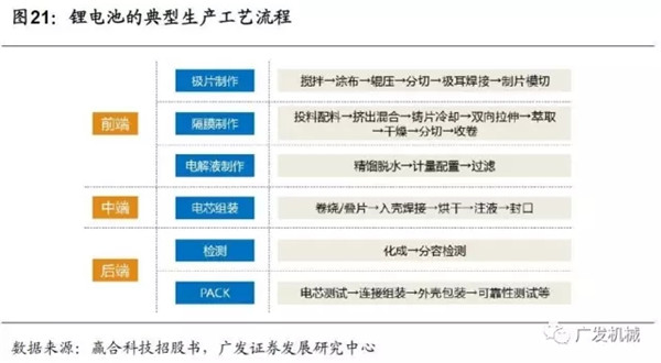 锂电池的生产工艺比较复杂,大致可分为极片制作、电池单元(电芯)制作和电池组装三个工段。锂电池极片制作工艺包括电极浆料制备、电极浆料涂布、辊压、分切、极耳焊接等工序;锂电池电芯制造工艺主要包括卷绕或叠片、入壳封装、注入电解液、抽真空并封装等;电池组装工艺主要包括化成、分容、组装、测试等。