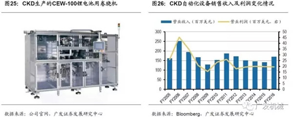 日本CKD公司成立于1943年,主要生产的产品有自动化机械、气动控制系统、流体控制系统以及省力系统。其中,日本CKD公司生产的CEW-100锂电池用卷绕机有3大竞争优势:1)彻底的防尘对策,采用区域封阻(ZoneBlock)的方式,将到卷绕部为止的各材料完全分离,通过控制各区域内的气流来防止粉尘的混入。2)高精度卷绕,在高速与高精度卷绕前采用纠偏装置进行补正,可以大幅降低卷绕不良的发生。3)高速卷绕卷绕速度1000mm/秒。是占有世界50%以上市场份额的自动机械。CKD将多年积累的伺服控制技术与高性能空气元件、凸轮技术相融合,充分保证了电池的品质和安全。