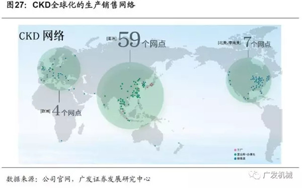 为了将最佳的商品和技术以及服务迅速且准确的提供给客户,日本CKD公司努力打造了全球化的生产销售网络。经过多年的积累,日本CKD公司分别在欧洲、北美、中南美、亚洲设立了服务网点。此外,除了在日本本土,CKD还分别在中国、泰国、韩国、马来西亚以及印度设立工厂。全球化的网络为公司的发展提供了强有力的支持。