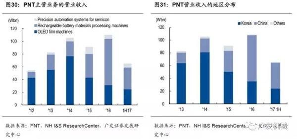 韩国以及全球新能源汽车的发展带动了韩国三星SDI、LG化学等动力电池企业的繁荣,作为三星SDI、LG化学等优质动力电池企业锂电设备的供货商,PNT锂电设备业务营业收入快速增长。从PNT营业收入的地区分布来看,中国市场对业绩的贡献逐年增大,并在2016年首次超过韩国本土。受益新能源汽车中国市场的发展,2017年上半年,PNT中国市场的营收占比进一步扩大,达到了61.9%,
