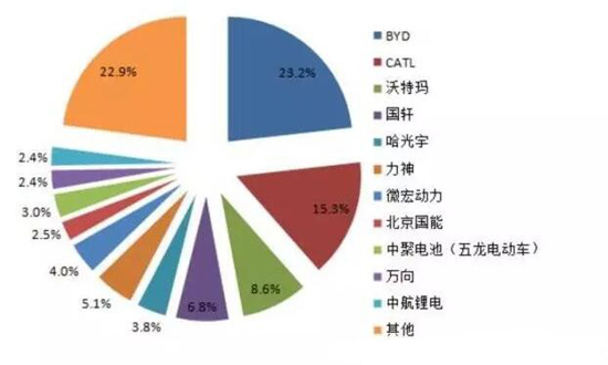 从市场份额看,比亚迪动力锂电池依靠旗下新能源汽车的优异表现,出货量达到3.69Gwh,产值在85亿左右,市场占比达到23.2%;CATL超越国轩成为动力电池第二,CATL公开发布的信息是2015年销售额超60亿,出货量达到2.43Gwh,市场占有率15.3%;沃特玛出货量达到1.37Gwh,市场占比8.6%。