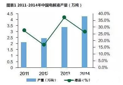 2014年中国锂电池电解液产量4.25万吨(含企业自产),同比增长33%,2014年中国电解液产值18.8亿元,同比增长16%。动力型电解液产量占总产量的22%。增长主要因为:1.动力电池电解液的需求增长超过100%;2.数码电池需求同比增长15%;