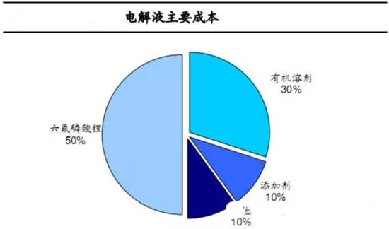 电解液的用量根据所使用正极材料的不同而有较大差异,1kWh动力电池中,有1.2kg的(如Leaf用的锰酸锂电池),也有1.6kg的(如Volt用的锰酸锂+NCM三元电池),也有2.16kg的(如秦PHEV用的磷酸铁锂电池)。电解液主要由溶质(六氟磷酸锂)、溶剂和添加剂构成,其中,六氟磷酸锂的制备用材主要是碳酸锂和相应的氟产品。
