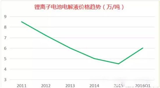 因此,2016年电解液价格基本能维持在7万元每吨以上。电解液价格的上涨因素来源于两个方面:一方面是新能源汽车的爆发式增长对需求的拉动;另一方面则是上游原材料(尤其是成本占比最大的六氟磷酸锂)价格上涨对电解液价格的传导与推动。