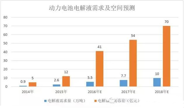 2016年我国动力电池电解液需求量可达 5.5 万吨,同比增长111%,动力电池电解液占比将达到62%;2017年动力电池电解液需求量将超过7.7万吨,同比增长40%以上,动力电池电解液占比将达到59%;2018年动力电池电解液需求量将达到10万吨,动力电池电解液占比将维持在60%。