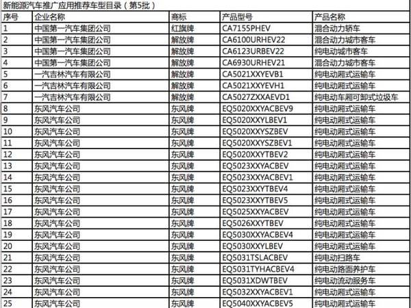 更新后的新能源汽车推广应用推荐车型目录(第5批)