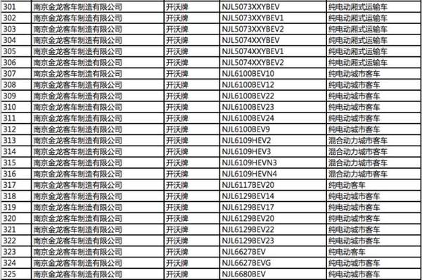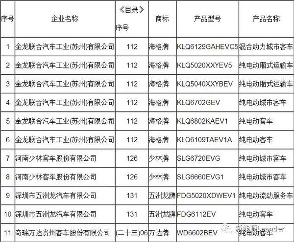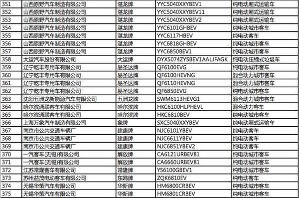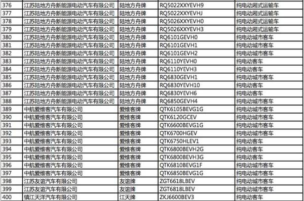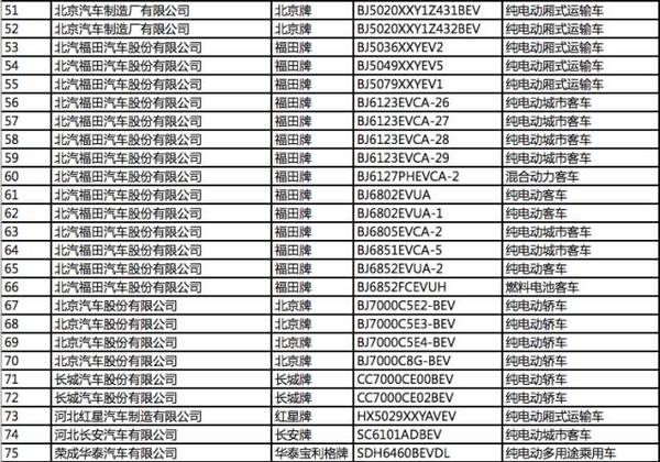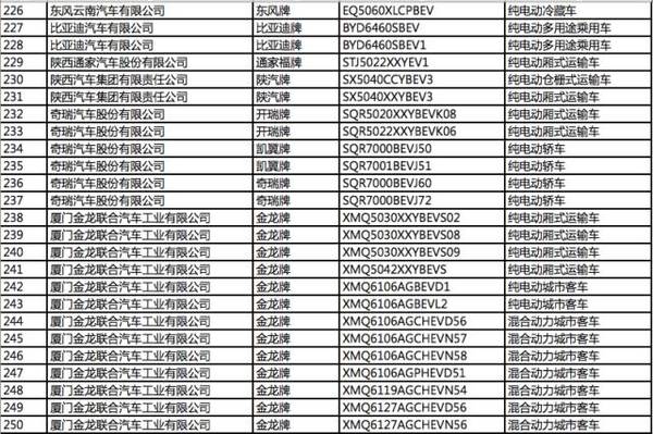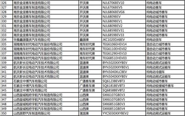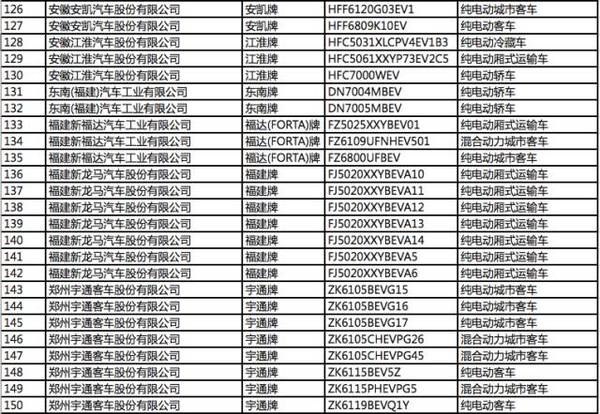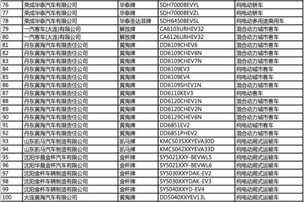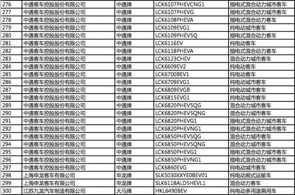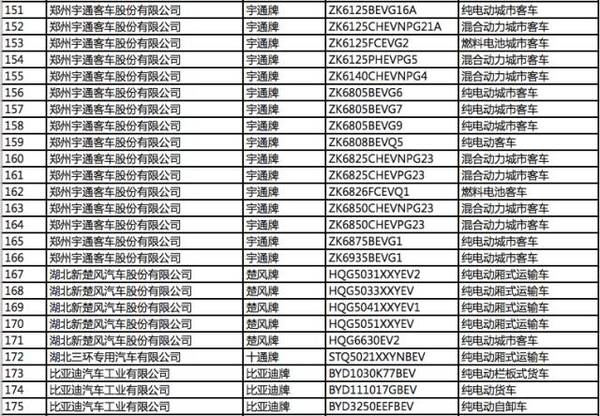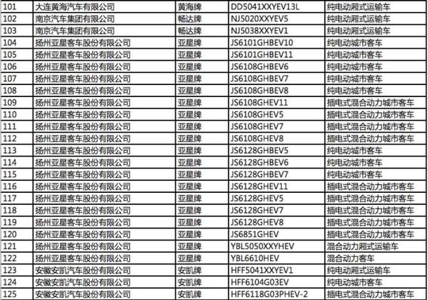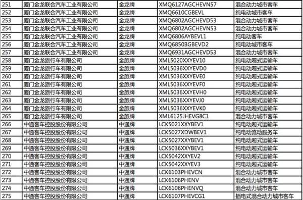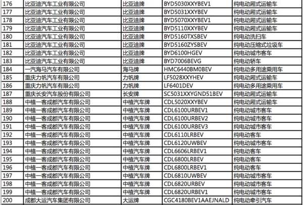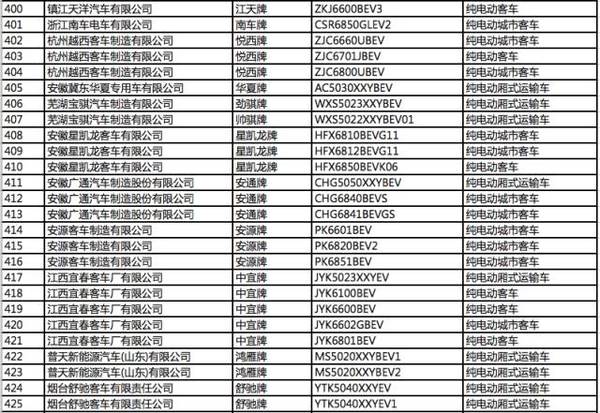 纯电动轿车/乘用车方面,北汽、长城、华泰、江淮、东南,比亚迪、海马、力帆、野马、奇瑞、江苏九龙等11家车企的24款车型入选。纯电动客车方面,一汽、东风、北汽福田、长安、黄海、亚星、安凯、新福达、宇通、比亚迪、中植汽车、野马汽车等200余款车型入选。插电式混合动力客车方面,亚星、中通客车、成都客车等品牌车型入选。