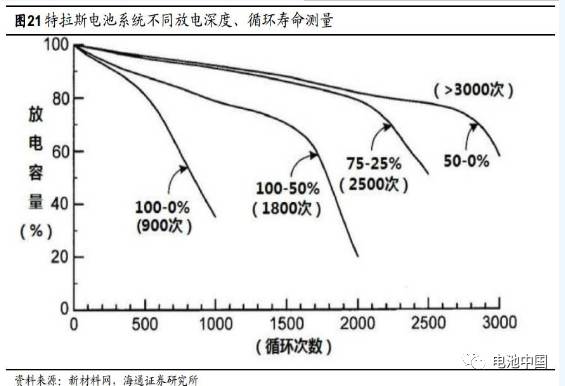 对于锂电池来讲,深放电机会越小寿命越长,反之,频繁地深放电(将电池电量用到20%以下)将导致电池寿命降低。特斯拉电池在其特有的工艺下,在50-0%循环模式(使用电池不超过50%的电量),电池总寿命延长一倍。而在深度循环模式下,900个循环后,容量衰减至50%。所以从保护电池寿命的角度来讲,可以尽量将每次行程控制在80%最大续航之内,避免用电超80%后再充电,但可定期深放电以激活电池。