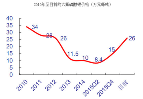 2011 年开始,以多氟多为首的国内厂商成功突破了六氟磷酸锂的生产工艺,并以价格优势进入国内电解液企业的供应链,随后日本企业为夺回市场份额被迫降价,导致六氟磷酸锂价格由2010年的34万元每吨下降至2015年第二季度的最低点8.4万元每吨,竟然下降了四倍之多,可见当初日本人赚了多少钱。