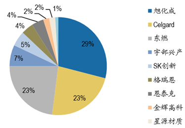 第一是日本旭化成29%,第二是美国Celgard 23%,第三是日本东燃23%,第四是宇部兴产7%,第五是韩国SK 5%,第七的恩泰克是美国企业,占4%。