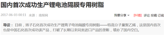 另外还有一点,目前隔膜生产在逐渐转向湿法生产,而湿法生产需要的主要上游原材料是高分子聚乙烯,2017年6月,国内扬子石化首次实现该材料的量产,打破了进口垄断。