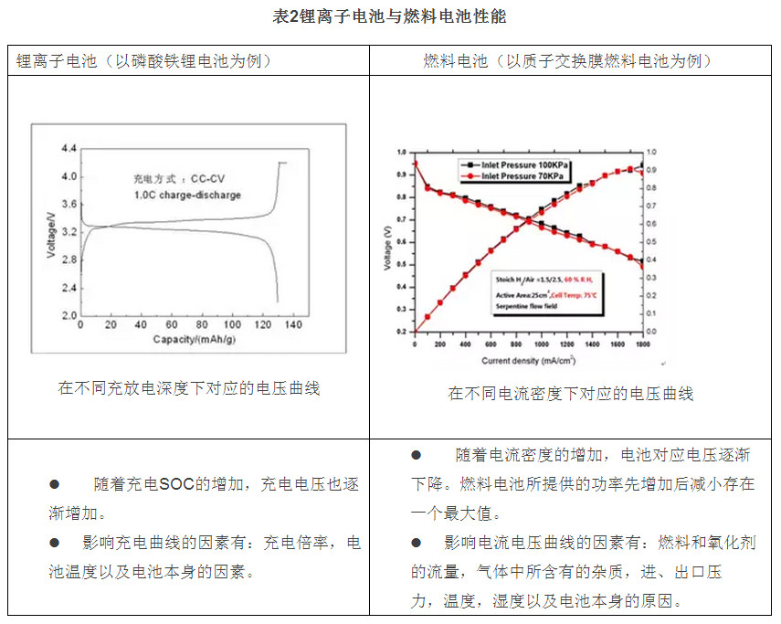 的大小由反应本身的性质、反应物和生成物的浓度以及反应温度决定。n为每摩尔反应物转移的电子摩尔数,F为法拉第常数。在标准状态下燃料电池的可逆电动势为1.25V左右,可逆电动势随温度升高而降低。而对于锂离子电池,由于在反应过程中正负极材料的结构不断发生变化,因此其可逆电动势也不断变化,电池的可逆电动势与反应发生的程度有对应的关系,因此可以根据OCV-SOC曲线,通过测量OCV判断电池的荷电状态。燃料电池和锂离子电池在实际使用过程中性能曲线如表2所示。
