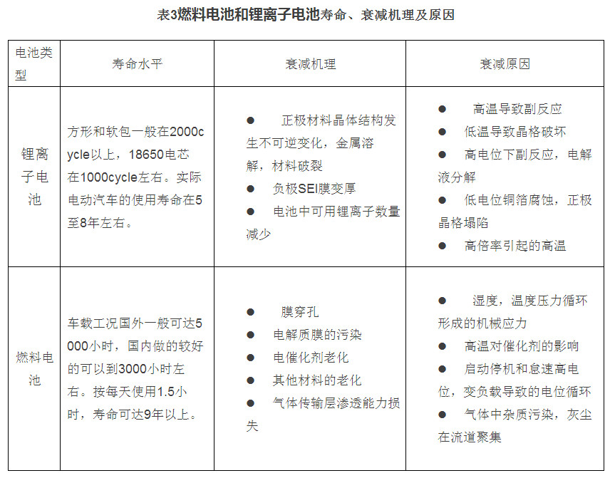 电动汽车完全以电池作为动力,更强调充电后的续驶能力,因而更关注电池的能量密度。锂离子电池能量密度提升受制于电池材料理论瓶颈。目前,国内电动汽动力型动力电池正极材料以磷酸铁锂(LFP)为主,负极材料仍主要采用石墨材料,其比能量约为 90~140Wh/kg 。而燃料电池是一种发电装置,能量密度远高于锂离子电池。在与能量密度直接对应的整车续驶里程方面,顶级豪华电动汽车Tesla的续驶里程刚达到500km;而以丰田Mirai、现代ix35为典型代表的燃料电池车续驶里程都在500km以上。因此在能量密度方面,燃料电池比锂离子电池好。