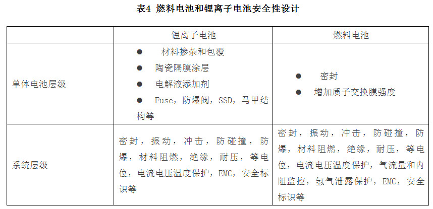 单体层级燃料电池的安全设计少于锂离子电池。系统集成层级燃料电池系统比锂离子电池系统复杂。由于使用了可燃气体氢气,多了对氢气的泄露保护设计。由于需要防止质子交换膜润湿不充分带来的影响,需要通过监控内阻来监控内部湿度的变化。燃料电池和锂离子电池相关安全性设计如表4所示。