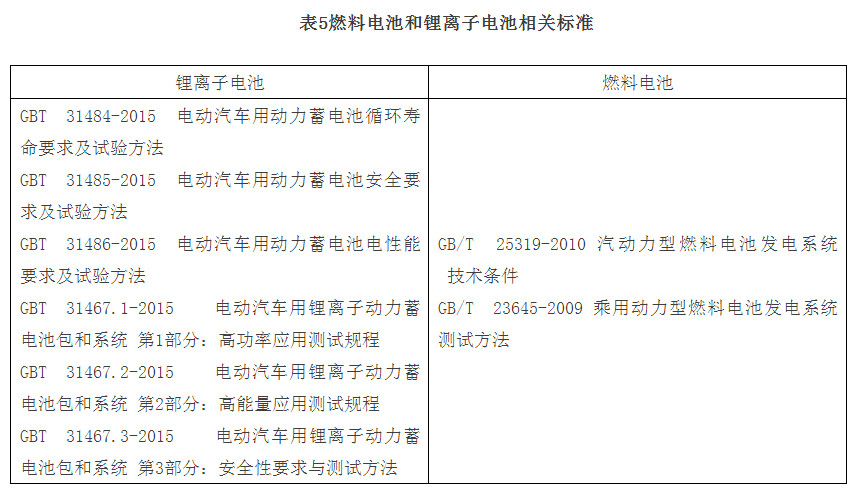 为了保证动力电池的安全性,国家针对动力型锂离子电池和燃料电池制定了一系列的标准,从而确保动力电池的安全性、可靠性。如表5所示,燃料电池相对锂离子电池的标准偏少,发行时间早,标准与现状符合性不如锂离子电池。电动汽车有对应的定型试验规程《GB/T18388—2005电动汽车定型试验规程》,而燃料电池车定型规程作为汽车行业对于新能源汽车产品定型的一个必备标准急待推出。