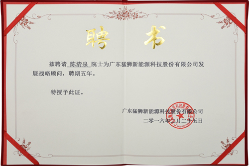 2016年2月25日,陈清泉院士再次莅临猛狮福建动力宝,董事长陈乐伍携猛狮高管接待陈院士一行,双方就猛狮新能源即将成立的院士专家工作站展开了会议。对于猛狮科技迫切提升企业科研水平以及团队创新能力,陈院士表示十分赞赏,并看好猛狮科技的发展前景,愿意同公司签署战略合作协议,并受聘猛狮科技发展战略顾问,今后,将充分发挥理论研究、前瞻性技术研发和科技人才资源优势,在猛狮三大板块的业务发展给予战略指导和技术支持。