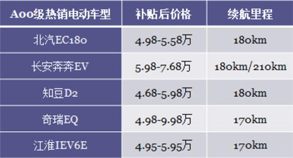 目前,该细分市场上最畅销的车型有北汽的EC180、长安奔奔EV、知豆D2、奇瑞的eQ和江淮的iEV6e。售价最便宜的知豆D2,仅售4.68万元,其续航能力可以达到180公里。