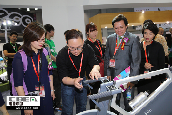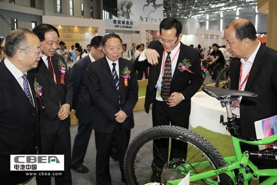 中国轻工业联合会会长步正发(左三)和中国自行车协会理事长马中超(左二)等在展台参观