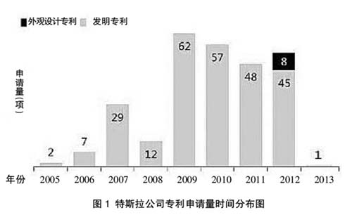 笔者使用国家知识产权局专利检索与服务系统,以申请人、发明人、关键词及IPC(国际分类号)为入口在中英文专利数据库中进行了检索。检索结果表明,截至2014年6月21日,特斯拉公司在全球范围内共公开了相关专利申请271项,其中发明专利申请263项,外观设计专利申请8项。从图1中所示专利申请时间分布的整体趋势来看,特斯拉公司从2005年开始提交专利申请,初期申请数量较少,2009年达到最大申请量62项,可以看出其前期的投入在5年后才取得突破性进展,该公司也由此赢得了最佳融资时机,于2010年在美国上市。随后该公司一直保持着较高的年专利申请量,每年的申请量均在40项以上。由于专利申请公开需要一段时间,2013年和2014年提交的专利申请数据目前还不能从数据库中获得,因此图1中显示的2013年和2014年申请数量较少。