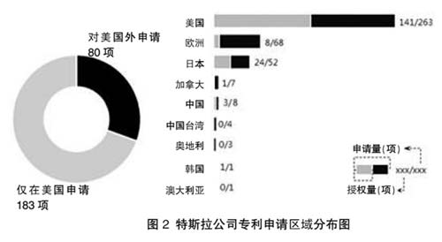 图2显示了特斯拉公司专利申请区域分布情况,从图中可知,其263项发明专利申请主要集中在美国,并且其中有183项仅在美国提交了专利申请。由此可见,特斯拉公司将美国作为其最重要的市场。