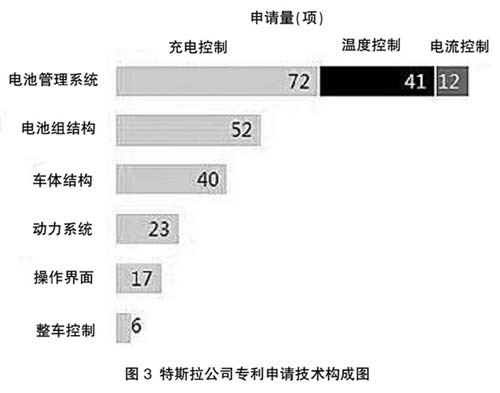对检索到的专利进行阅读标引和技术分析,得到图3所示的专利申请技术构成图。可以看出,特斯拉公司的专利申请主要涉及电池管理系统(包括电池组的充电控制、温度控制以及电流控制)、电池组结构、车体结构、动力系统、操作界面、整车控制等领域,其中在电池管理系统、电池组结构、车体结构领域,其提交的专利申请量较大。在特斯拉公司擅长的电池管理系统领域,其专利申请量达到125项,占其总发明申请量的47.5%。该公司在电池组结构方面的专利申请也达到了52项,可以看出,特斯拉公司在电动汽车电池方面投入的科研力量最大,与电池相关的专利申请已占总申请量的67%。与此同时,由于特斯拉公司开发的纯电动汽车与传统纯电动汽车不同,其在车体结构、动力系统和操作界面等领域也有一定投入。