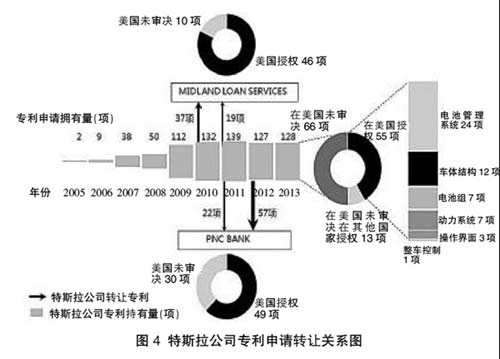 埃伦·马斯克宣布特斯拉公司将开放所有专利技术,那么特斯拉公司真正拥有多少专利呢?笔者对特斯拉公司的专利权属转让情况进行了深入检索统计分析,发现近年来特斯拉公司对所持有专利进行了很多专利权转让。如图4中所示,从INCOPAT数据库获知,在2010年至2012年间,特斯拉公司名下的271项专利申请中有超过135项发生过专利权属转让(assignment),其中79项转让给了PNC银行协会(PNC BANK,NATIONAL ASSOCIATION),56项转让给了米德兰贷款服务公司(MIDLAND LOAN SERVICES,INC.),并且有20项专利申请涉及两次权利转让,都是先转给米德兰贷款服务公司,再转让给了PNC银行协会。