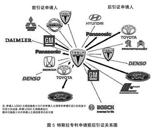 笔者又继续对特斯拉公司与电动汽车相关企业的技术关联性进行了研究。将特斯拉公司所持有的美国专利进行引证和被引证分析后,得出了如图5所示的特斯拉专利申请前后引证关系图。
