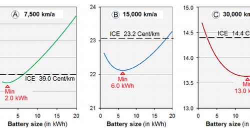 研究中,他们选定了在德国境内三种比较典型的驾驶行为:A——每年行驶里程7500公里,B——每年行驶里程15000公里,C——每年行驶里程3万公里。