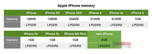 然而这样的情况会在下一代iPhone中有所改观,前两天台媒“科技新报”称,已经有了部分关于iPhone6s的消息:iPhone6s将采用最新的2GBLPDDR4内存。今年iPadAir2已经用上了2GB内存,为下代iPhone开了一个好头。对苹果来说,把原来采用的LPDDR3内存加大实际并不难,成本也不高。只是苹果出于省电的考虑,更加希望直接用上LPDDR4内存,毕竟LPDDR4内存相比LPDDR3能耗降低了40%。