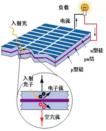 答:光伏电池是一种具有光‐电转换特性的半导体器件,它直接将太阳辐射能转换成直流电,是光伏发电的最基本单元。光伏电池特有的电特性是借助于在晶体硅中掺入某些元素(例如:磷或硼等),从而在材料的分子电荷里造成永久的不平衡,形成具有特殊电性能的半导体材料。在阳光照射下,具有特殊电性能的半导体内可以产生自由电荷,这些自由电荷定向移动并积累,从而在其两端形成电动势,当用导体将其两端闭合时便产生电流。这种现象被称为“光生伏打效应”,简称“光伏效应”。
