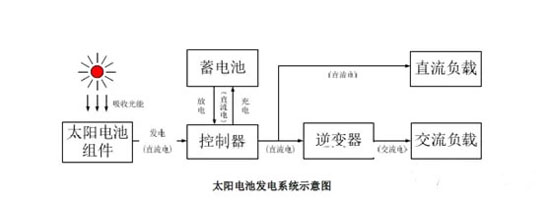 答:光伏发电系统由光伏方阵(光伏方阵由光伏组件串并联而成)、控制器、蓄电池组、直流/交流逆变器等部分组成。光伏发电系统的核心部件是光伏组件,而光伏组件又是由光伏电池串、并联并封装而成,它将太阳的光能直接转化为电能。光伏组件产生的电为直流电,我们可以直接以直流电的形式应用,也可以用逆变器将其转换成为交流电,加以应用。从另一个角度来看,对于光伏系统产生的电能我们可以即发即用,也可以用蓄电池等储能装置将电能存放起来,按照需要随时释放出来使用。其系统组成如下图所示。