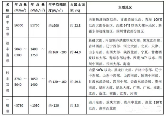 答:我国太阳能总辐射资源丰富,总体呈“高原大于平原、西部干燥区大于东部湿润区”的分布特点。其中,青藏高原最为丰富,年总辐射量超过1800kWh/㎡,部分地区甚至超过2000kWh/㎡。四川盆地资源相对较低,存在低于1000kWh/㎡的区域。