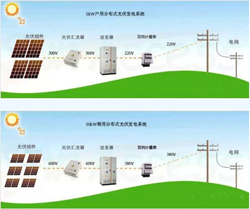 答:分布式光伏系统并网电压主要由系统装机容量所决定,具体并网电压需根据电网公司的接入系统批复决定。一般户用选择220V接入电网,商用选择380V接入电网。系统电压情况如下图所示。