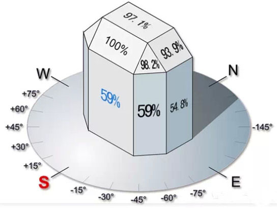 答:由于影响光伏发电的主要原因为日照量,所以组件安装时应向阳光最充足的方向安装。不同安装角度对光伏组件的发电效率亦有影响,假定最佳安装角度的效率为100%,不同方位、角度安装光伏组件的效率见下图: