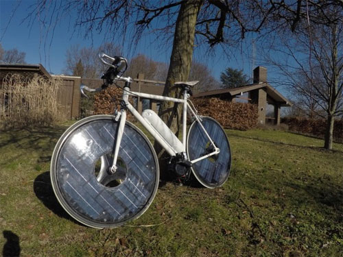 由丹麦设计师 Jesper Frausing 设计的Solar Bike,两侧单车车轮上都有装设太阳能电池,单车内建可蓄电电池。当单车静止时,太阳能发电将储存电力于电池中;当单车开始移动时,则靠电池及太阳能电池供给电力。但Solar Bike将太阳能电池安装于单车两侧车轮,在非正面朝向太阳光照射方向的情况下,使其吸收光线上有些难度。