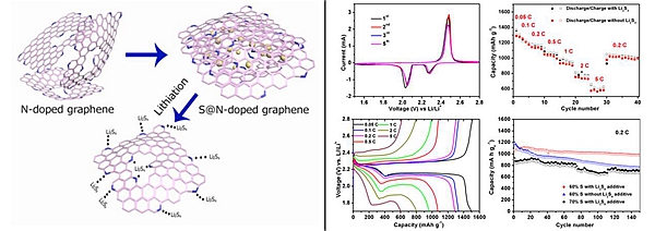图2. S@NG作为导电基质材料对多硫化物的吸附和组装的锂硫电池电化学性能(Nano Letters,2014, 14, 4821−4827)