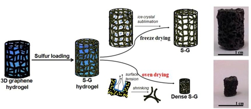 此外,课题组成员运用低温反应,减缓化学反应速率,在3D还原氧化石墨烯上负载均匀的硫膜,并在空气中干燥使得3D还原氧化石墨烯孔洞收缩,得到致密的S-G复合材料,增强S与还原氧化石墨烯的粘附,固定纳米硫和抑制多硫化物的溶解损失,提高了S石墨烯复合材料的比容量和循环稳定性(Nano Energy,2015,12,468-475)。