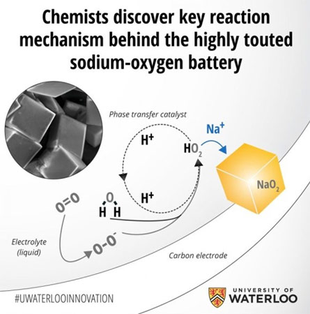 滑铁卢大学(University of Waterloo)的化学家们发现了钠空气电池中的关键反应,这个发现为电化学能量存储的发展铺平了道路。反应的关键在于Nazar团队发现的质子相转移催化剂。Nazar和同事们把质子相转移催化剂从电池的放电和充电反应中分离出来,这提高了电池的容量,对电池的充电几乎完美。研究人员还发现把催化剂从系统中移除后,电池停止了工作。不同于传统的固体电池设计,氧化金属电池使用气体阴极,它获取氧气,然后将氧气与钠或锂这样的金属结合并形成金属氧化物,同时在此过程中存储电子。而给系统通电又会引起相反的反应,使金属变回原始状态。