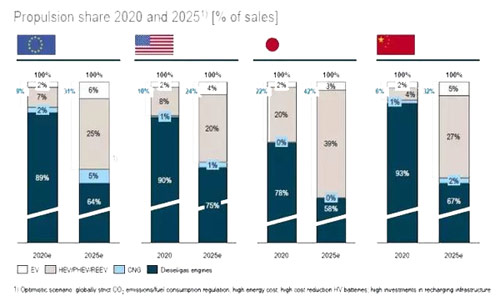 对于不同的全球市场和地域来说,比例略有不同。欧洲市场2020年纯电动和插电式混合动力在所有销售的汽车总量里将占9%,2025年将占31%;中国市场 2020年纯电动和插电式混合动力在所有销售的汽车总量里将占7%,2025年将占32%;美国和日本的数据分别是11%,24%和22%,42%。