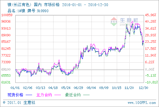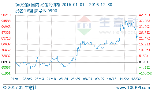 如上图显示,2016年国内镍市震荡上扬,年末有小幅回调。监测数据显示,年初国内镍现货均价在69162.5元/吨,年末在85412.5元/吨,全年涨幅23.5%。11月24日达到全年最高价格95937元/吨,创一年新高。