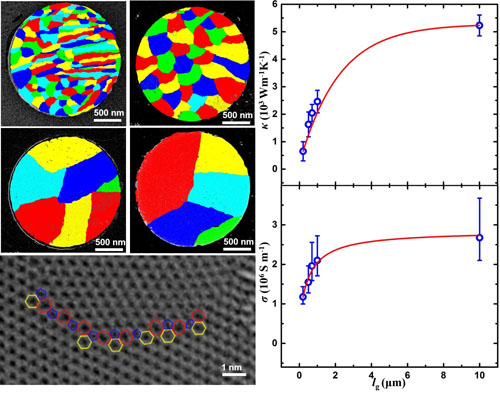 最近,中国科学院金属研究所沈阳材料科学国家(联合)实验室先进炭材料研究部石墨烯研究组采用溶碳量适中的金属铂片作为生长基体,发展出一种基于“析出-表面吸附生长”原理的CVD方法,仅通过改变析出温度便实现了对石墨烯形核密度的控制,制备出晶粒尺寸在~200 纳米到~1 微米范围内均一可调、且晶界完美拼合的高质量单层多晶石墨烯薄膜。在此基础上,获得了晶粒尺寸对多晶石墨烯的电导率和热导率的影响规律及晶界电阻率(~0.3 kW·μm)和晶界热导(~3.8×109Wm-2K-1),发现减小晶粒尺寸可导致热导率的显著降低但对电导率的影响较小。根据该影响规律推算,当石墨烯的晶粒尺寸从1毫米减小到5纳米时,其热导率的衰减幅度可达300倍,而电导率的衰减仅为10倍左右,并且热导率和电导率随晶粒尺寸变化的变化率高于典型的半导体热电材料。