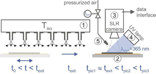 ①-对流槽喷嘴干燥机,②-温控板,③-SLR相机,④-UV灯,⑤-加压空气喷嘴