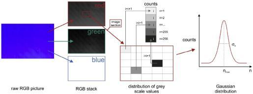 原始的RGB图像分割成红(red)、绿(grenn)、蓝(blue)三原色,将图像划分为10 X 10个部分,计算分析每个部分细节。对像素点三原色分量灰度值进行计数,然后做成高斯分布图,标准偏差σ和平均灰度值nmax作为图像处理的特征量