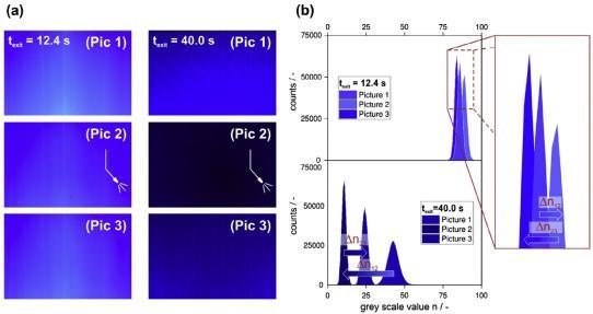 图5 (a)在两个干燥时刻,各自连续拍摄的三张照片的比较。捕捉第二张照片时,用加压空气喷嘴向照相区域涂层上直接喷射空气气流。(b)在较短干燥时间(texit=12.4s)时,三张照片中获得的nmax都很大,差值Δn12和Δn23小并且都落在试验值偏差范围内。而texit=40.0s时,三个nmax都很小,喷嘴作用导致的差值Δn12和Δn23很大。