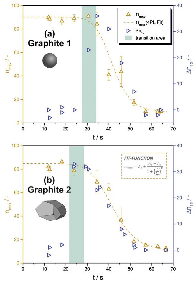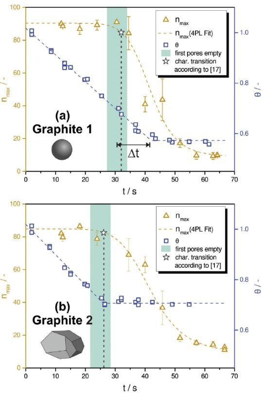 (a)Graphite 1 (球形, d50 = 8.9 μm) , (b) Graphite 2 (多面体, d50 = 20.4 μm)。从nmax开始减少到平台结束的时间间隔以以绿色突出显示,这表明第一个孔洞形成时刻。五角星标记是文献【17】的转换时间。