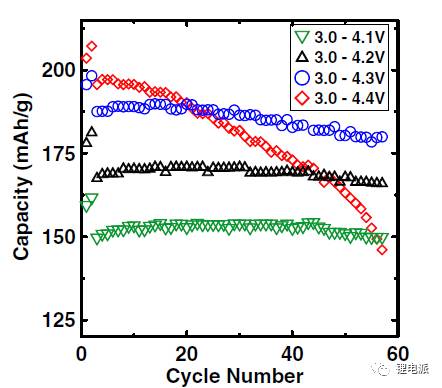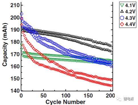 由图中可以看出,在较高截止电压条件下,活物质克容量、电池容量都高,但是电池容量和材料的克容量衰减地也更快。反而是较低的截止电压(4.2V以下)下,电池容量衰减缓慢,循环寿命更长。